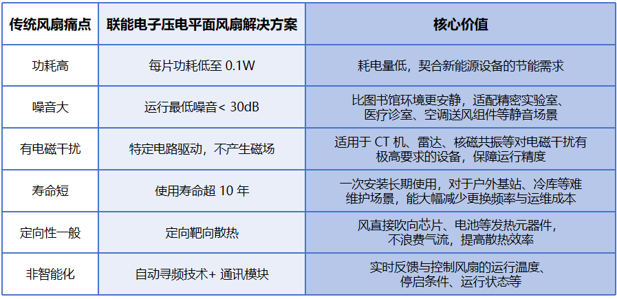 傳統(tǒng)風(fēng)扇存在功耗高、噪音大、有電磁干擾、壽命短、定向性一般、非智能化等 6 大短板,聯(lián)能電子壓電平面風(fēng)扇逐一攻克: